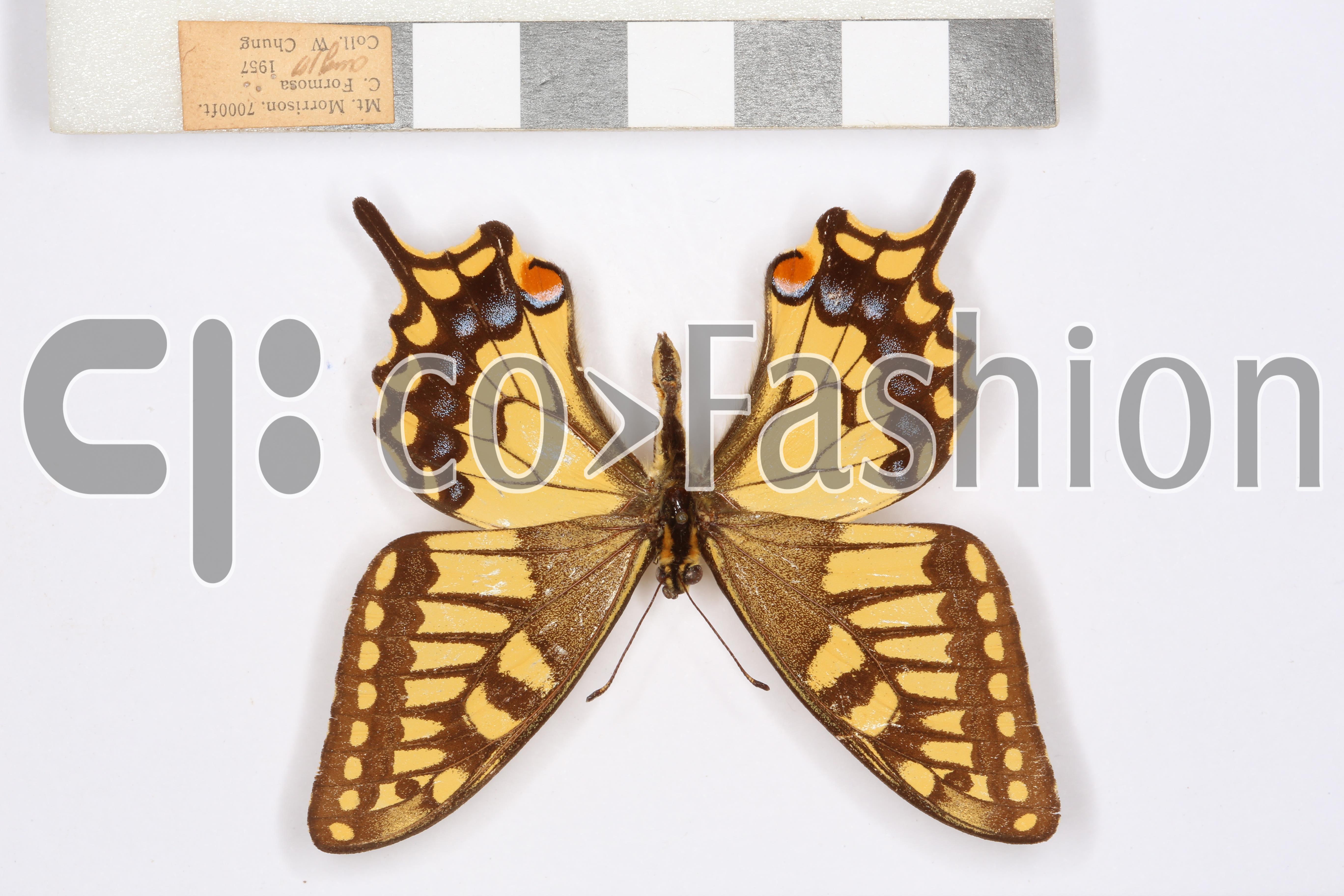 黃鳳蝶Papilio machaonsylvina Hemmi 模式產地:machaonLinnaeus, 1758:瑞典;sylvina Hemming,1933:臺灣。 英文名:Yellow Swallowtail 別 名:金鳳蝶 形態特徵Diagnostic character 雌雄斑紋相似。軀體底色黃色,背面黑褐色,腹部腹面有兩條黑褐色細縱線。前翅外緣近直線狀;後翅外緣波狀,M3脈末端有一細長尾突。翅背面底色黑褐色,上有黃色條紋及斑點。前翅基部有一片散布黃色鱗的暗色斑塊,後翅沿內緣亦有類似斑紋。後翅臀區有一紅斑。翅腹面黃色紋遠較背面發達。 生態習性Behaviors 資料尚不充分,可能一年多代,冬季以蛹態越冬。成蝶飛行靈活快速,會訪花。 雌、雄蝶之區分 Distinctionsbetween sexes 由於雌雄斑紋相似,可靠的性別鑑定有賴檢視腹端交尾器。